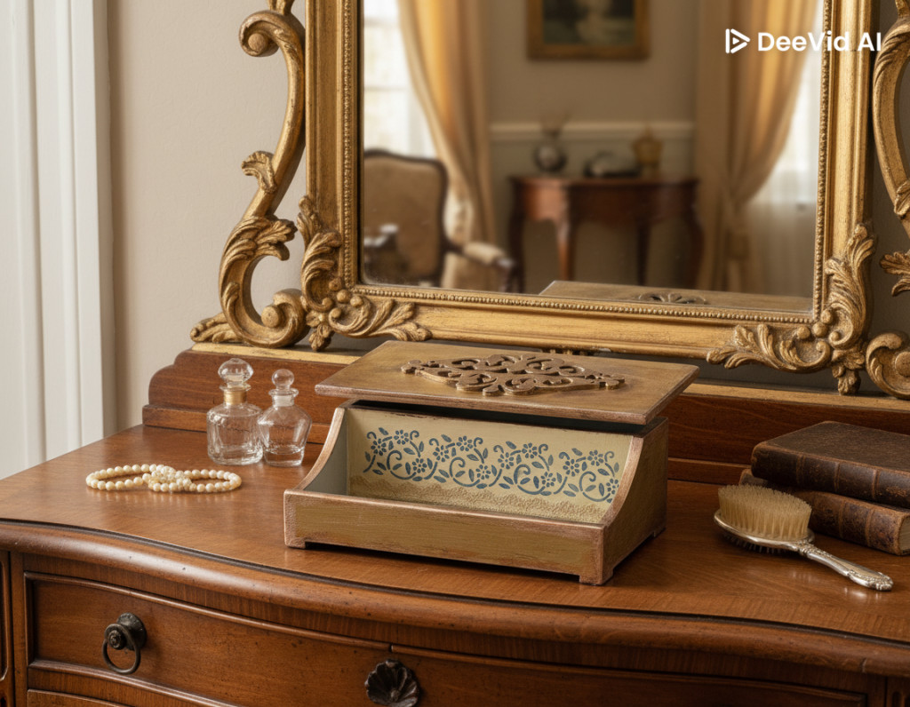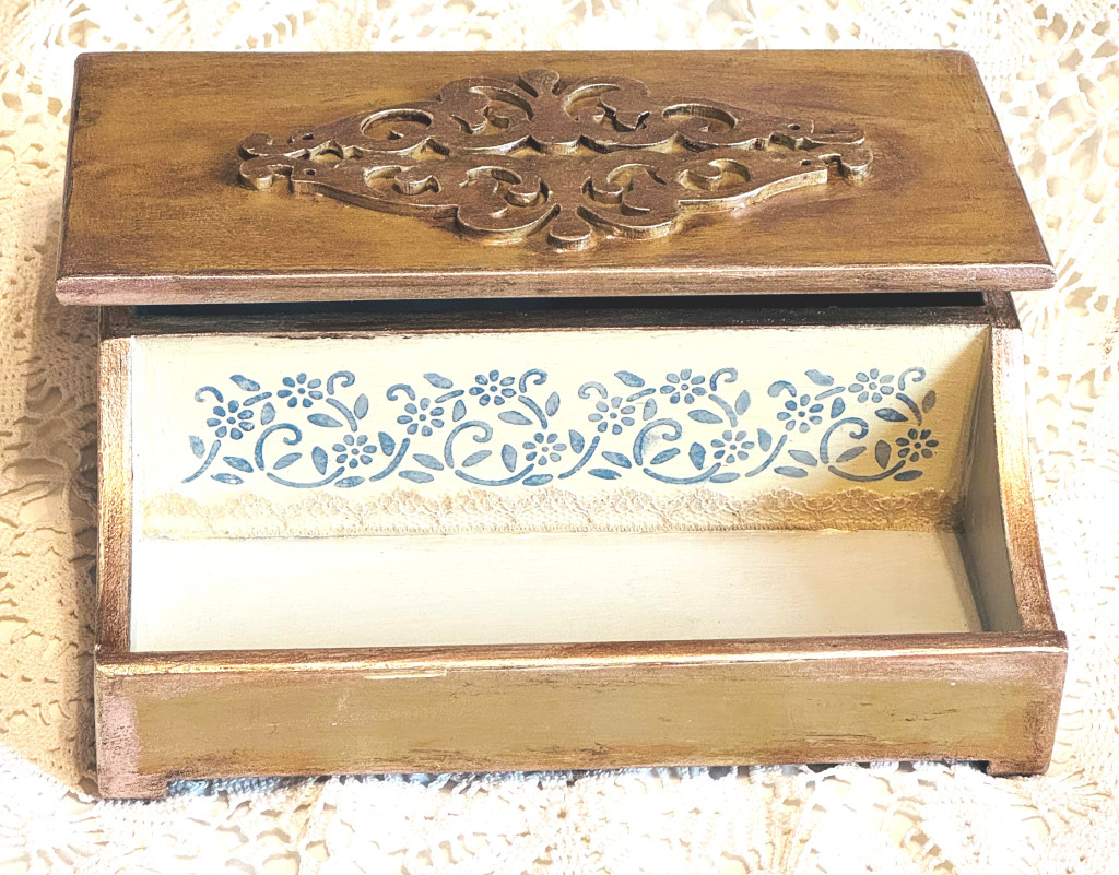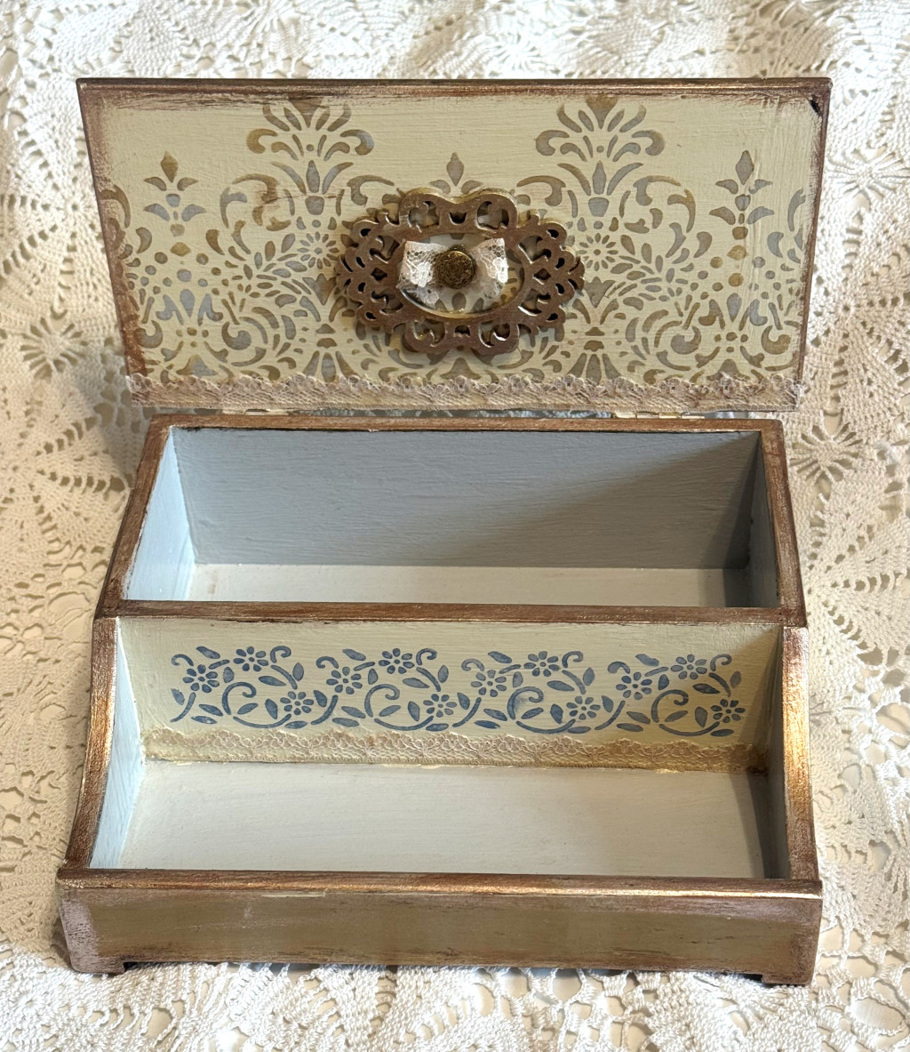 Két különálló rekesszel rendelkezik, így praktikus tárolási lehetőséget nyújt ékszerek, levelek, varróeszközök vagy személyes emlékek számára. A díszített fedél belső oldala tovább erősíti a prémium és vintage megjelenést.