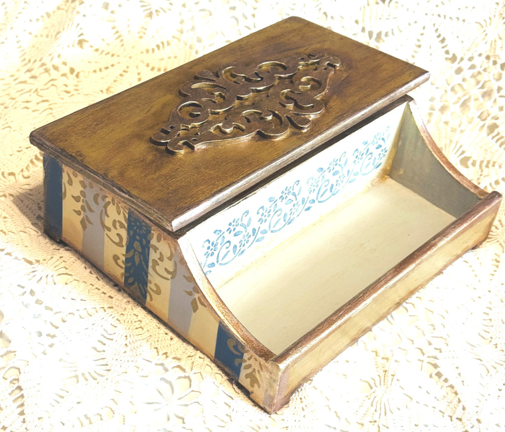 A „Bájos Idők” vintage fa tárolódoboz egy szeretettel és odafigyeléssel készült, egyedi kézműves alkotás. A finoman antikolt felület, a pasztell árnyalatok és a klasszikus stencilminták időtlen, romantikus hangulatot teremtenek neki. Kézzel készült, egyedi darab . Csak ez az EGY DARAB van belőle a világon!