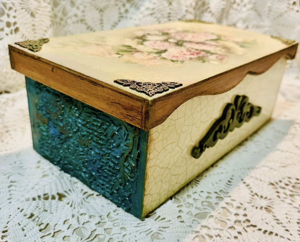 Ez a kézzel készült, vintage stílusú díszdoboz ideális kincstartó és lakásdekoráció. A sokoldalú tároló rekesz elegendő helyet biztosít mindennapi használatra, miközben visszafogott vintage hangulatot teremt.